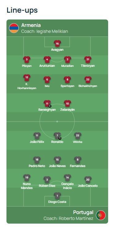 世预赛-葡萄牙客战亚美尼亚首发:C罗领衔!菲利克斯、B费出战