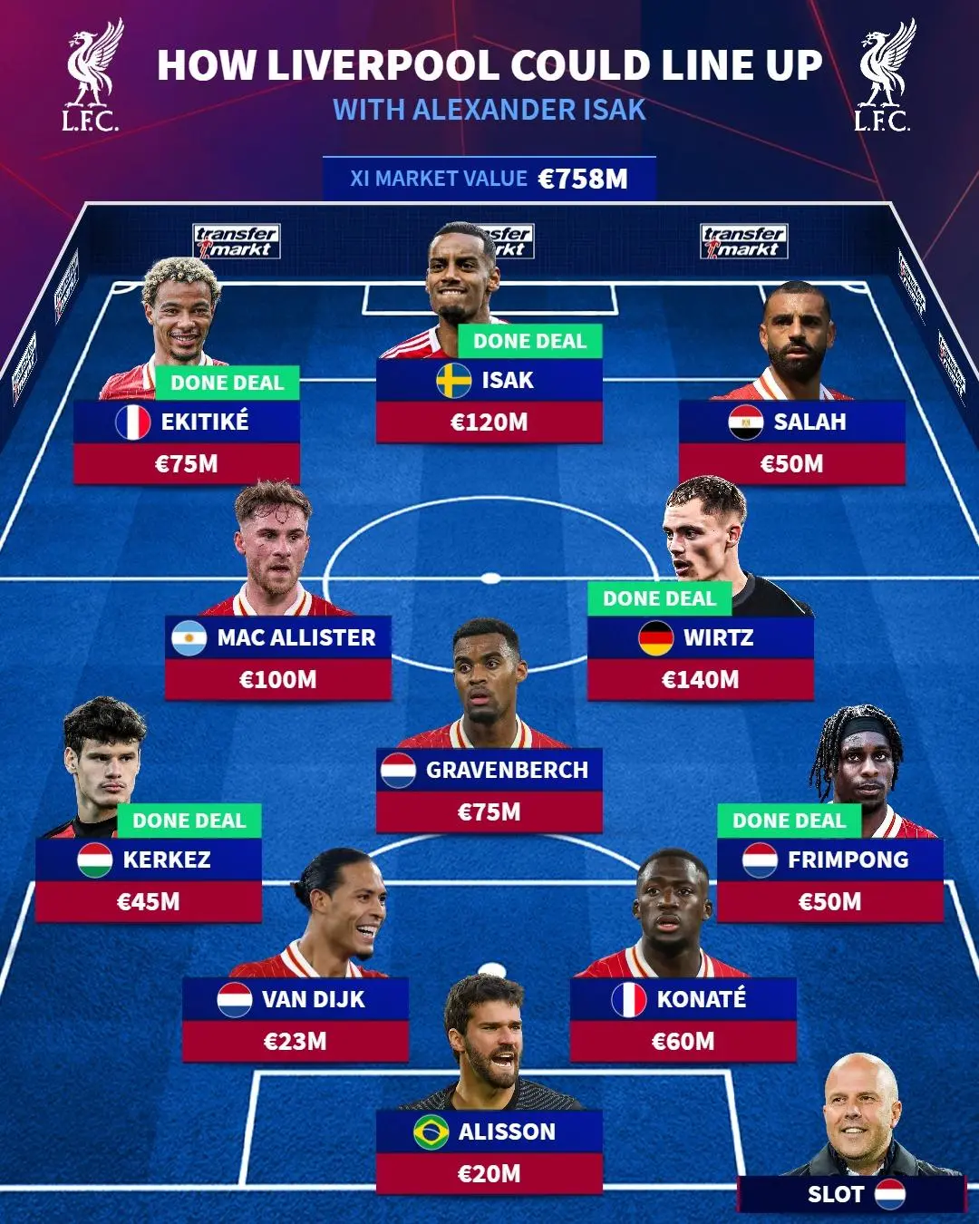 虎扑09月02日讯 利物浦在今年夏天斥巨资完成多笔重磅引援,德国转会市场对斯洛特的球队首发阵容进行了预测。