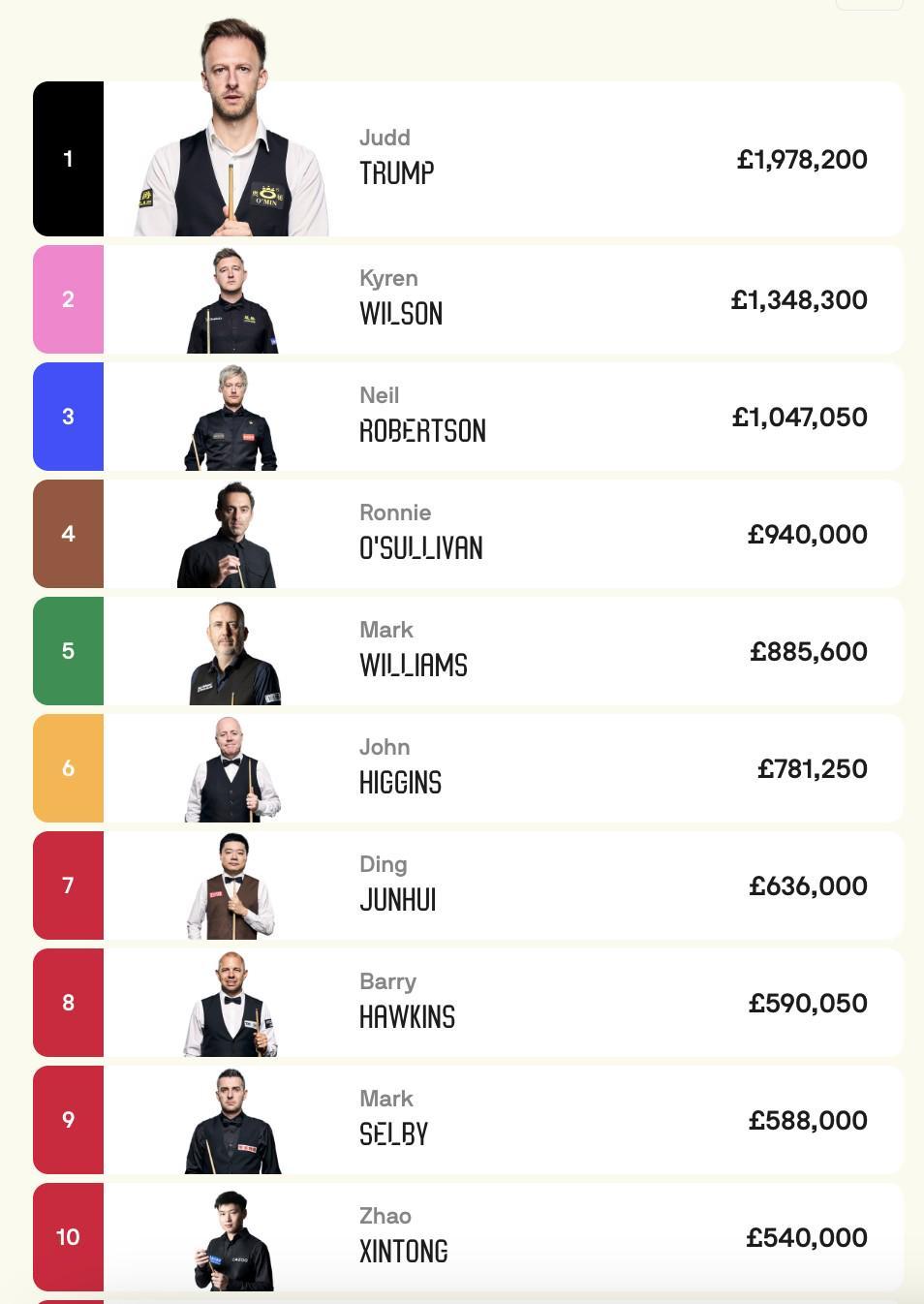 斯诺克沙特大师赛落下帷幕,罗伯逊10-9险胜奥沙利文,夺得冠军,这也让他的世界排名上升至第三位,仅次于特鲁姆普和威尔逊。
