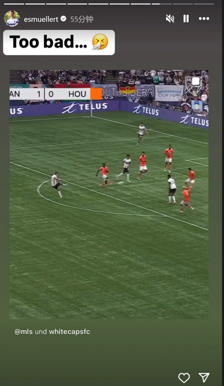 穆勒远射破门遭判无效 社交媒体发文直呼遗憾 xiaoqiao 2025年08月20日 23:29 72 0 美职联最新战报:8月18日温哥华白浪与休斯顿迪纳摩1-1握手言和。新援穆勒完成俱乐部首秀,一记精彩远射因越位被判无效。赛后穆勒在社交媒体发布进球视频,遗憾表示:"差之毫厘。"